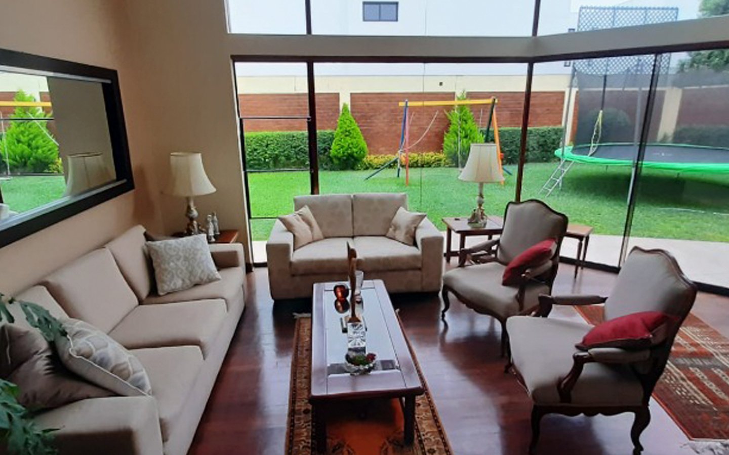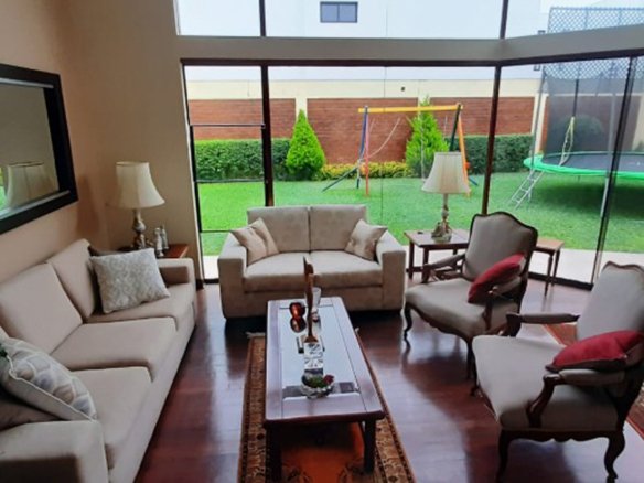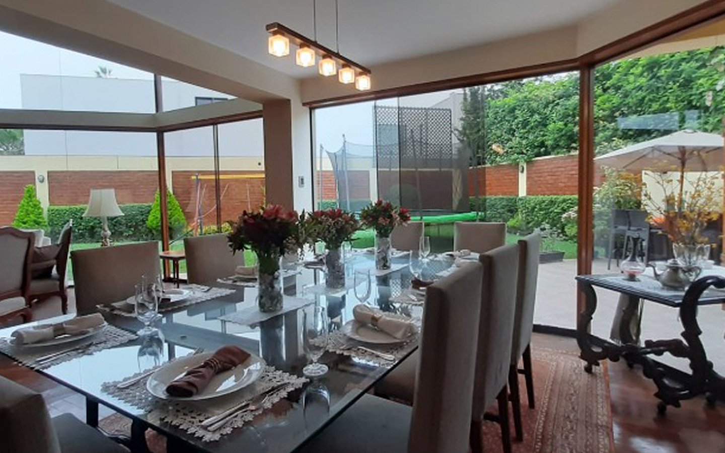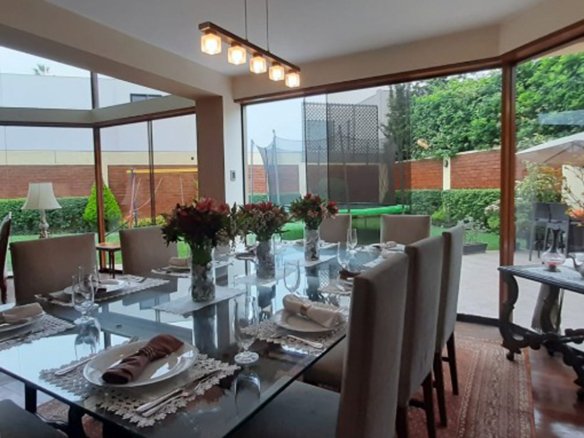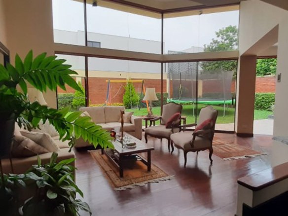Amplio ingreso con piso de mármol, sala y comedor con pisos de madera que van a terraza con BBQ