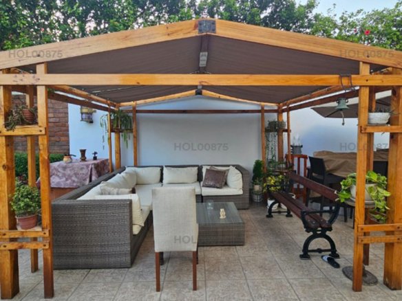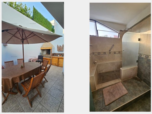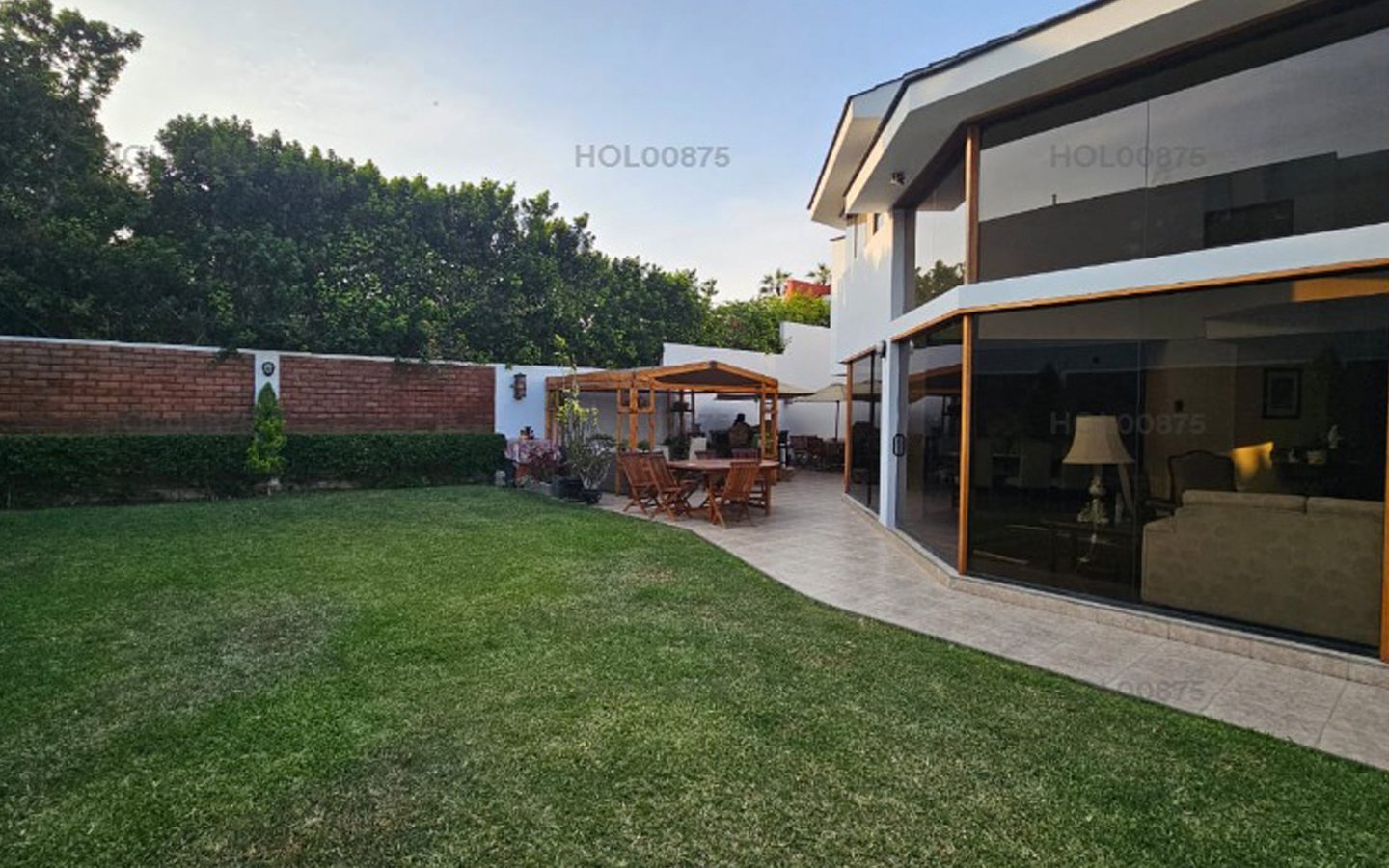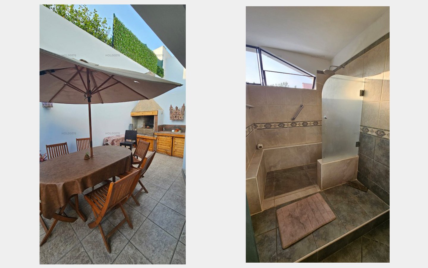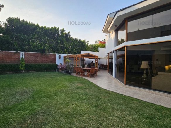 Amplio ingreso con piso de mármol, sala y comedor con pisos de madera que van a terraza con BBQ