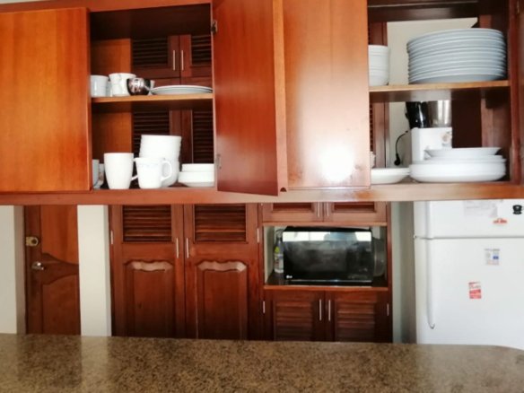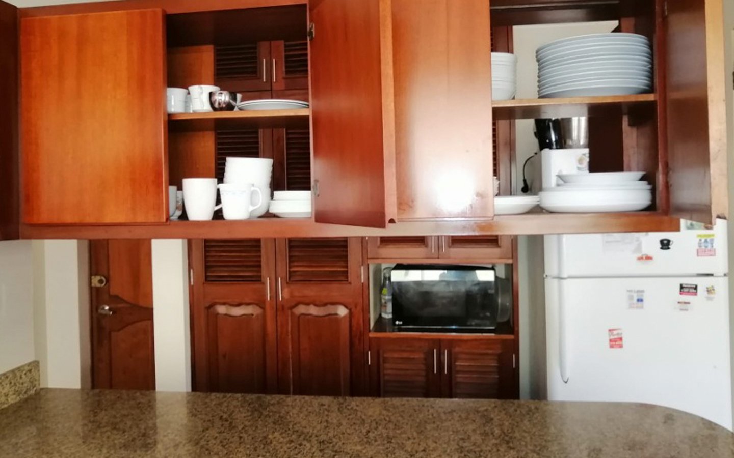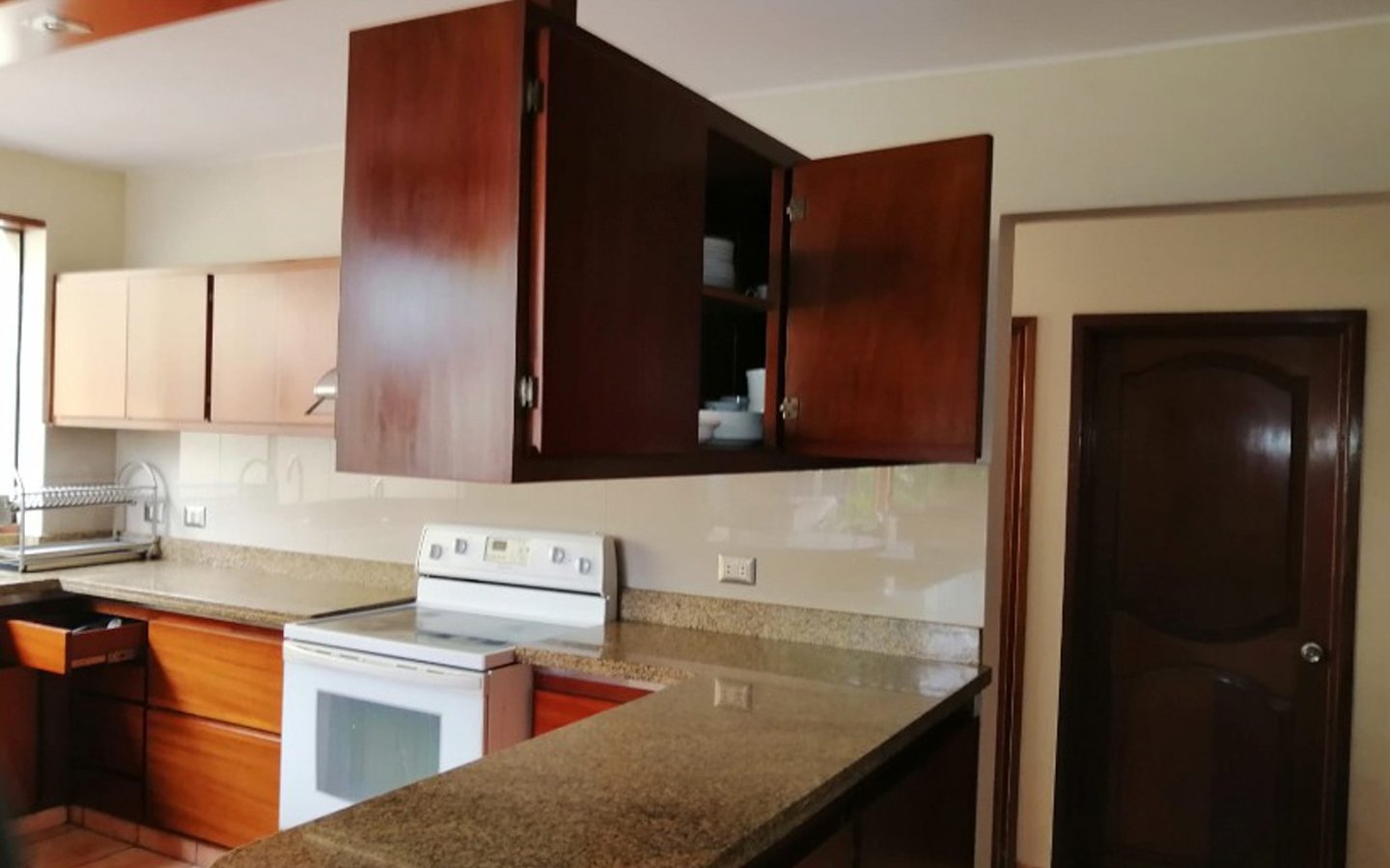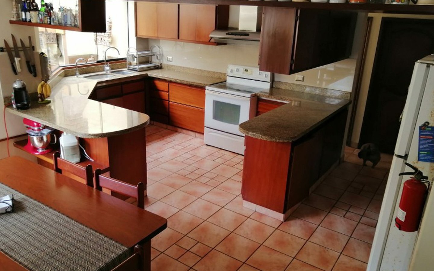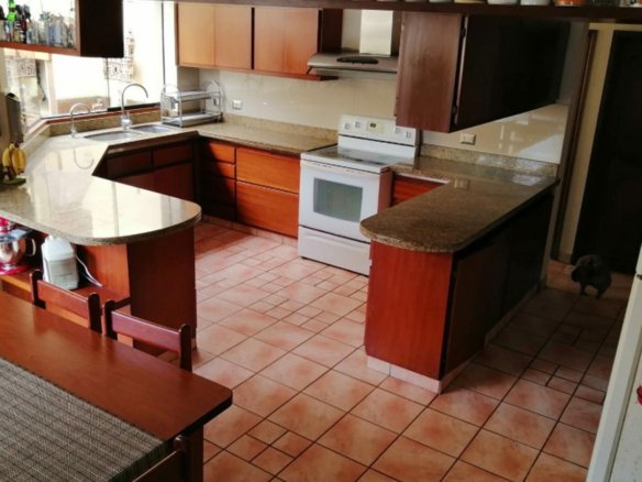 Cuenta con baño de visitas, sala de estar, escritorio, una cocina muy cómoda con isla con tope de granito