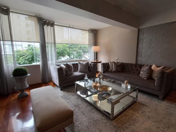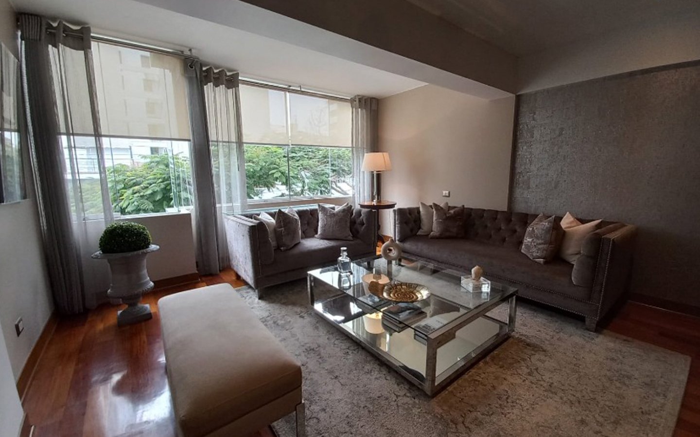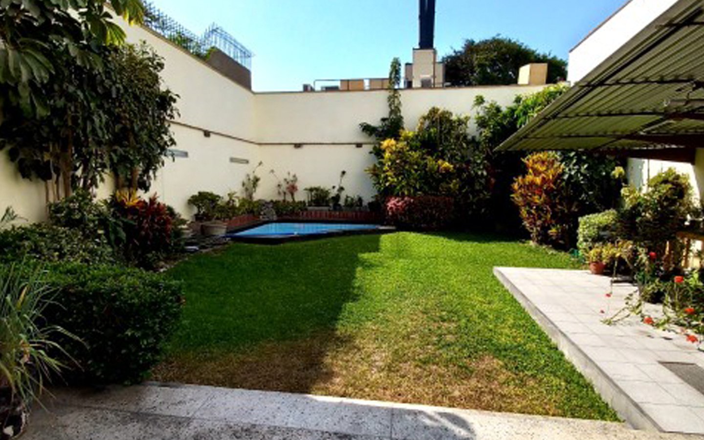 hall, 1 sala comedor, comedor de diario, cocina cerrada, lavandería, escritorio, estar familiar, 3 dormitorios, walk-in closet, 3 baños, 1 cuarto de servicio, 1 baño de servicio, pisos de madera en área privada, pisos de madera en área social, terraza, jardín interior, jardín, sótano.