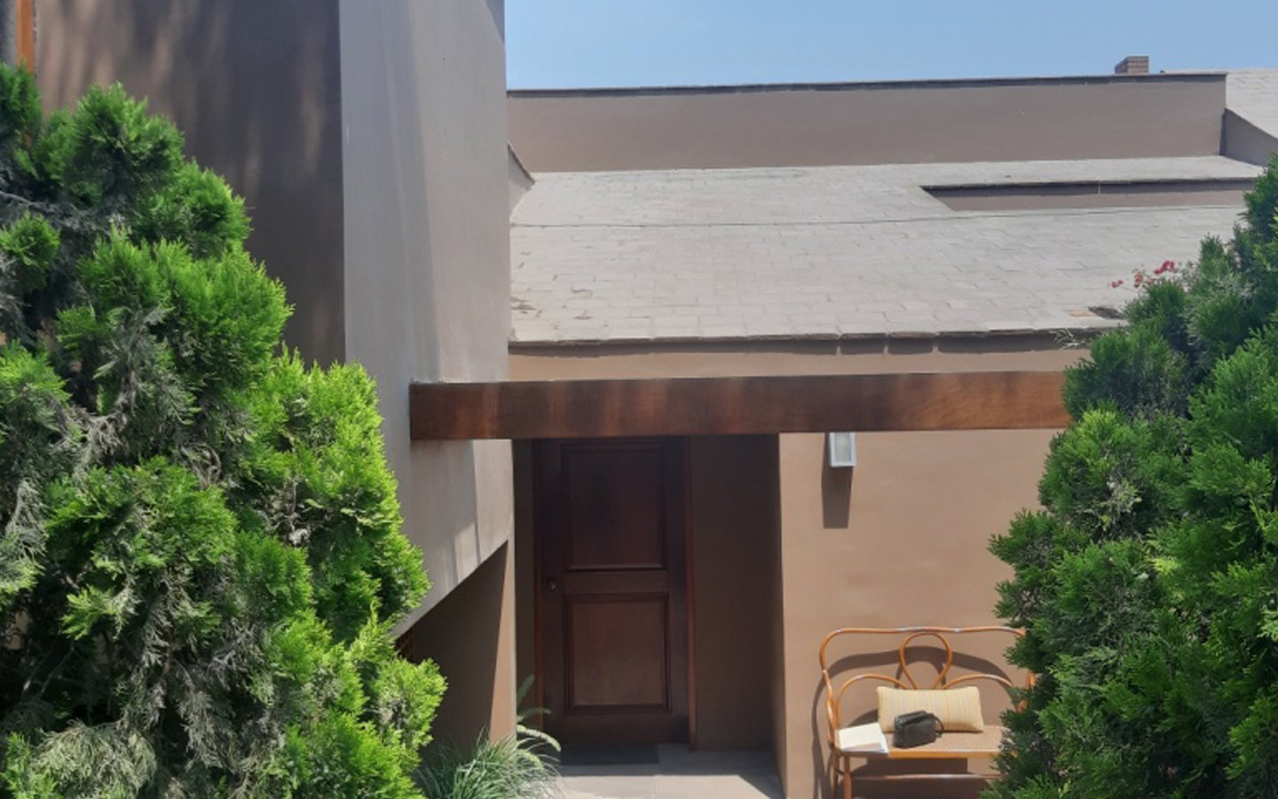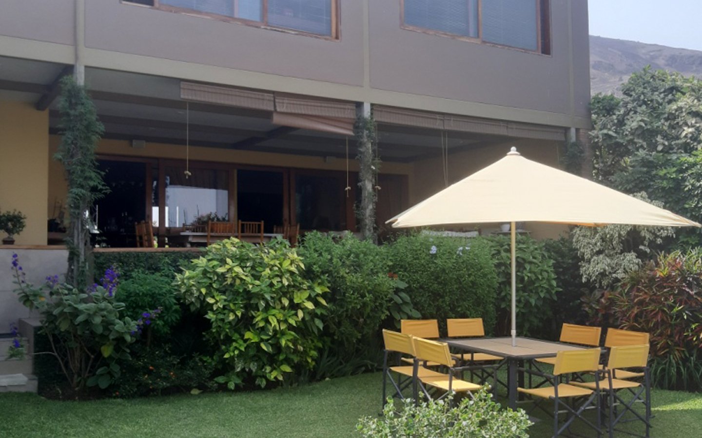 El ingreso a la casa cuenta con una terraza de laja y jardines muy bien mantenidos a ambos lados