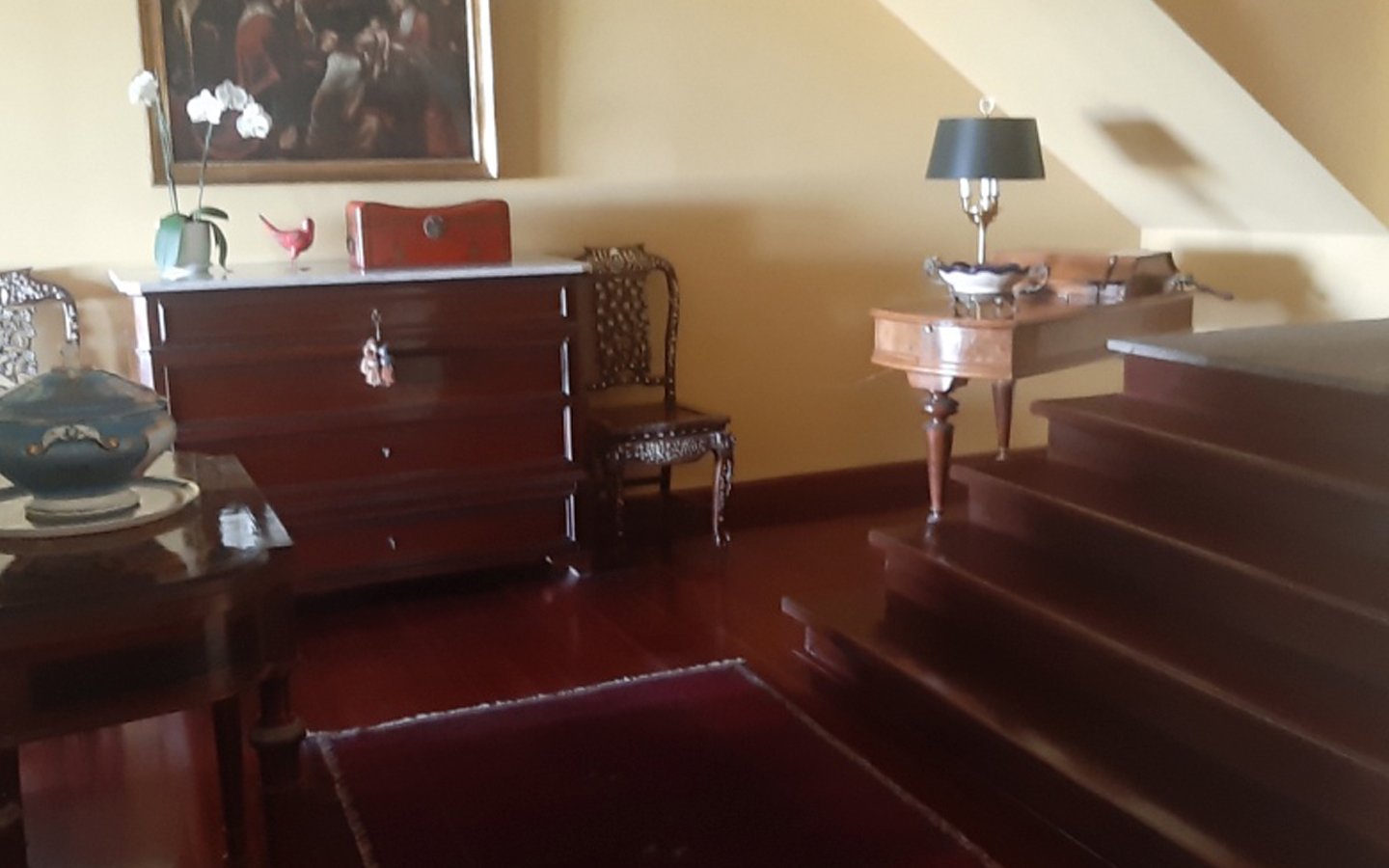 • Porsche de ingreso con piso de laja a desnivel (4 escalones con paso y contrapaso de madera hacia abajo) amplia sala, comedor amplio ambos con vista a terraza y piscina, ½ baño de visita remodelado, inmensa biblioteca con estudio y baño incorporado (remodelado) amplia terraza interior con zona de BBQ y hermosa piscina, jardines.