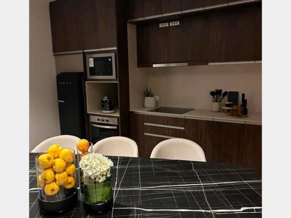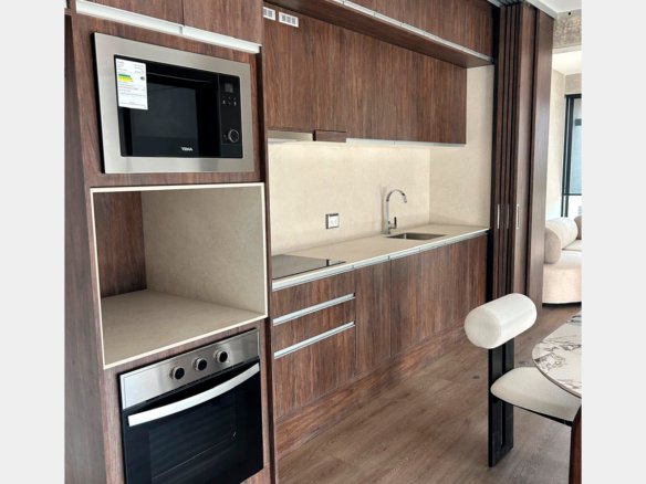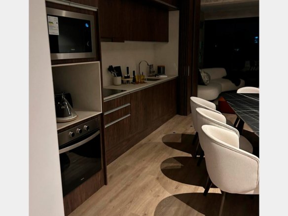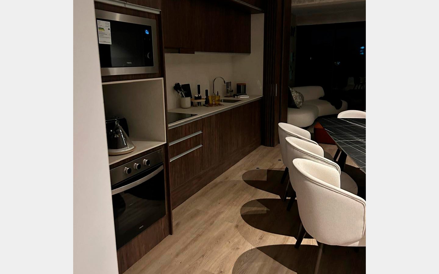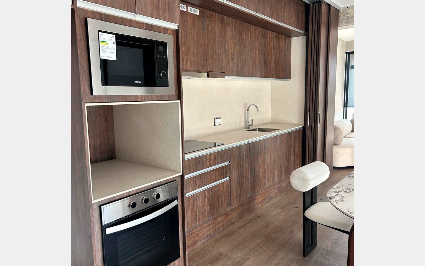 - Los departamentos se entregan con cocina amueblada y equipada con torre de hornos (tradicional y microondas), cocina empotrada y campana extractora de kitchen center.