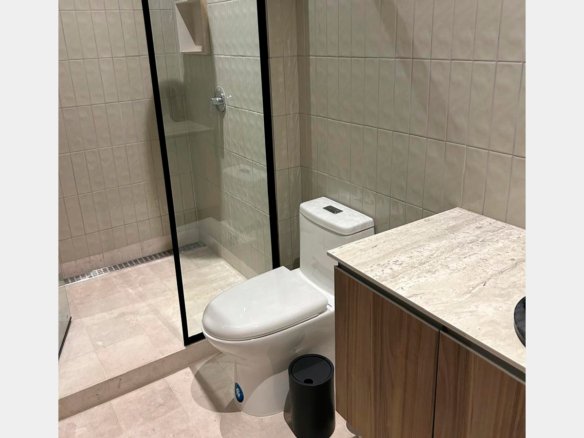 - Baños con tableros de piedra natural en color blanco y muebles de melamine, inodoros tipo one piece y lavatorio tipo bowl empotrado