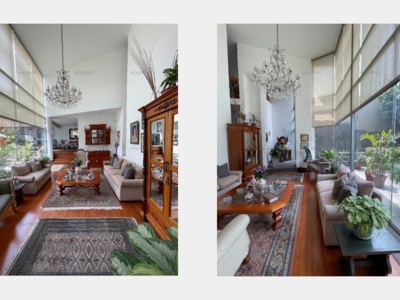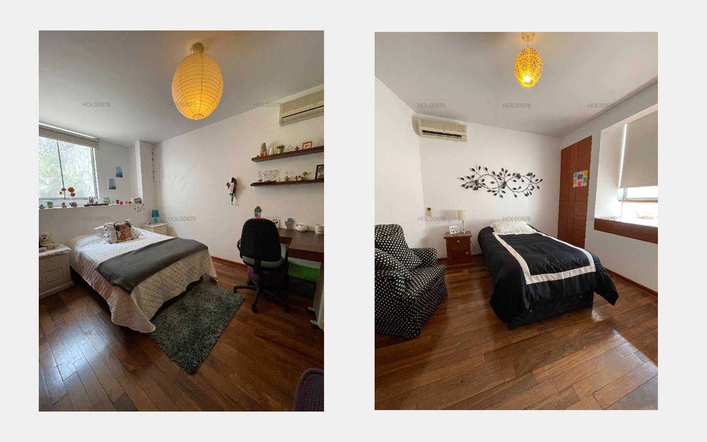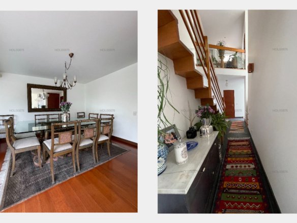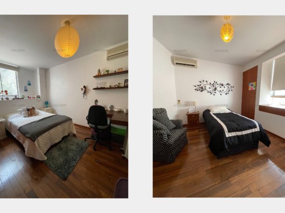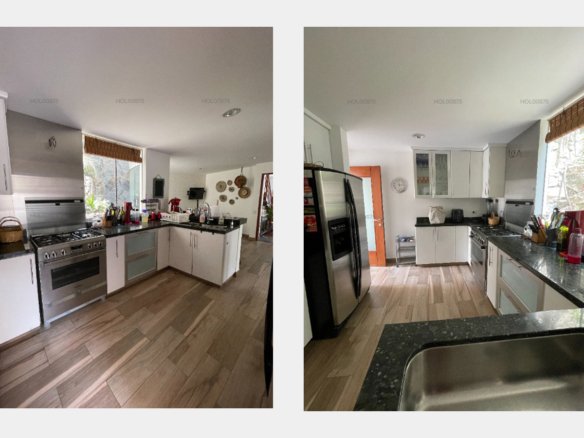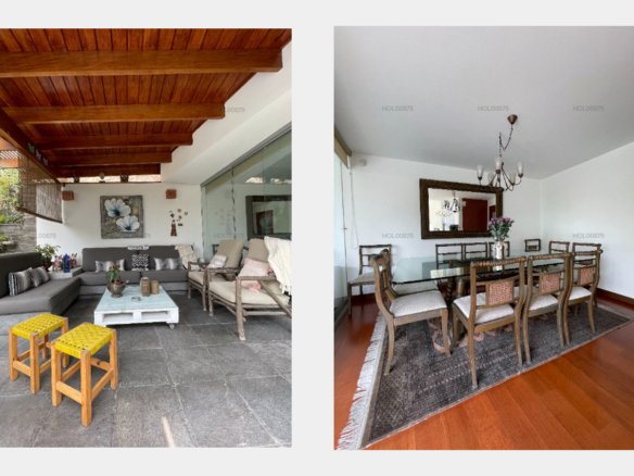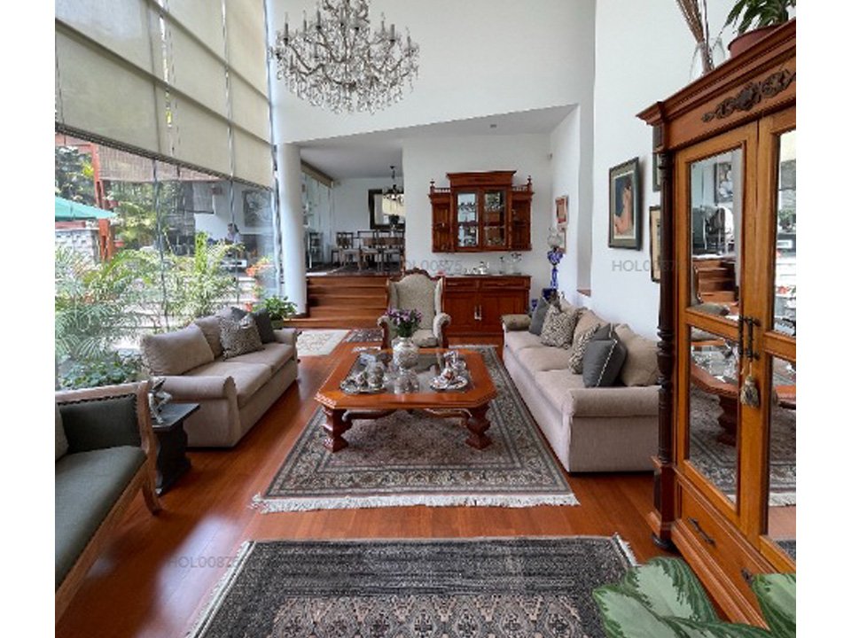 Hall, 1 sala, comedor, comedor de diario, cocina cerrada, lavandería, escritorio, estar familiar, 5 dormitorios, walk-in closet, 5 baños, 3 baños incorporados, tina en el baño, 1 cuarto de servicio, 1 baño de servicio, pisos de madera en área privada, pisos de madera en área social, terraza, jardín interior, patio, jardín, piscina, parrilla.
