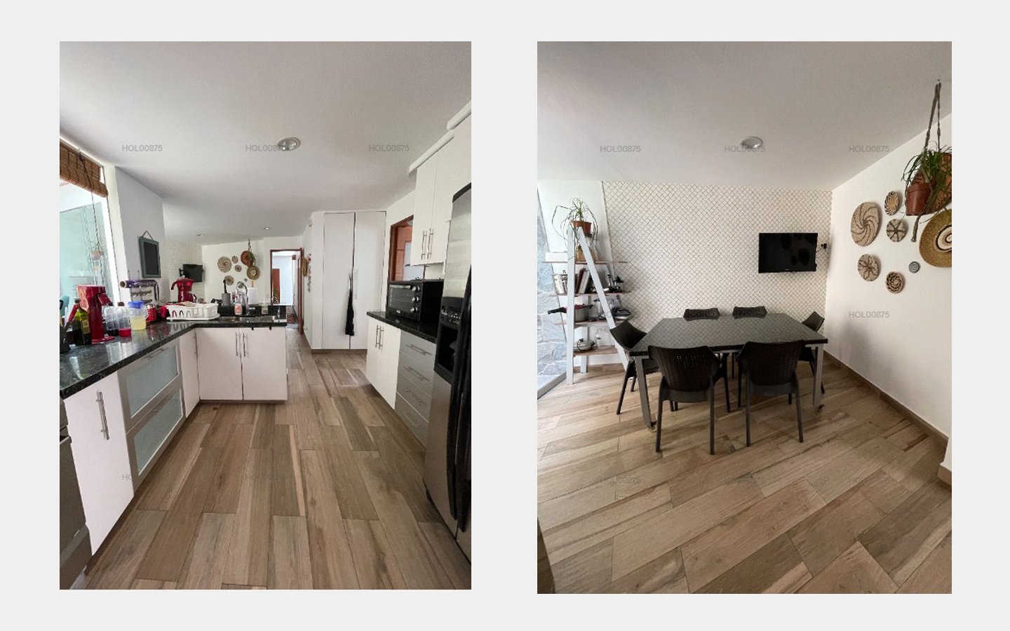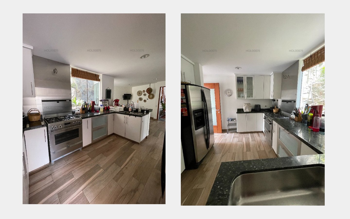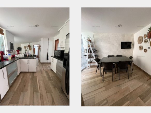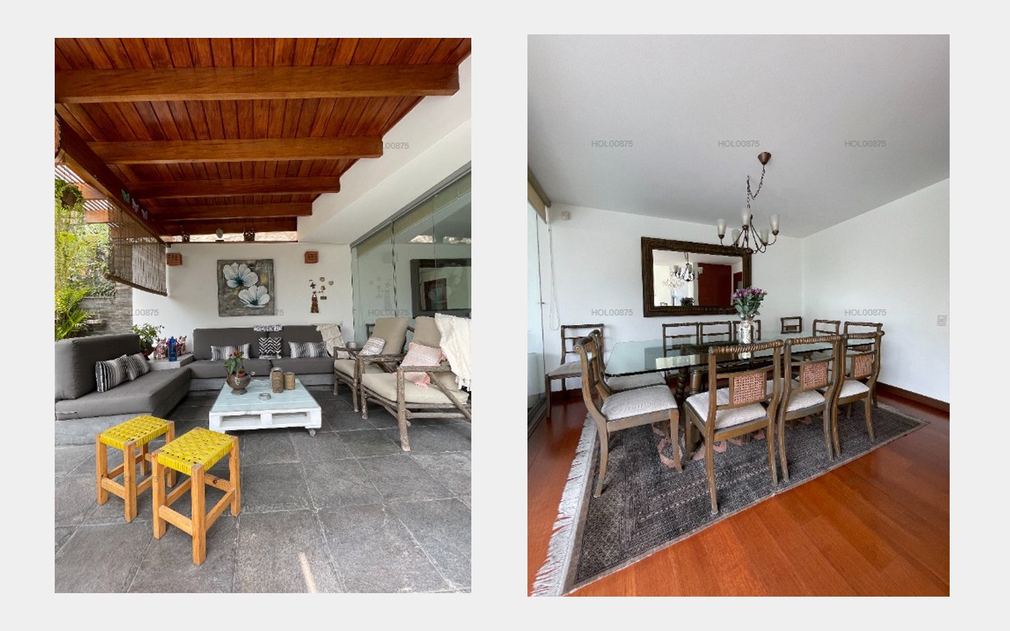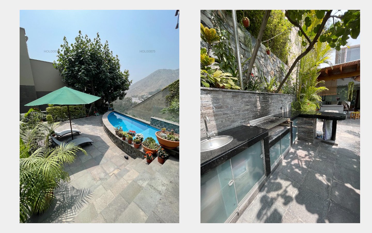 Sala, comedor, terraza, jardín, piscina, BBQ, baño de visita, cocina, área de servicio.