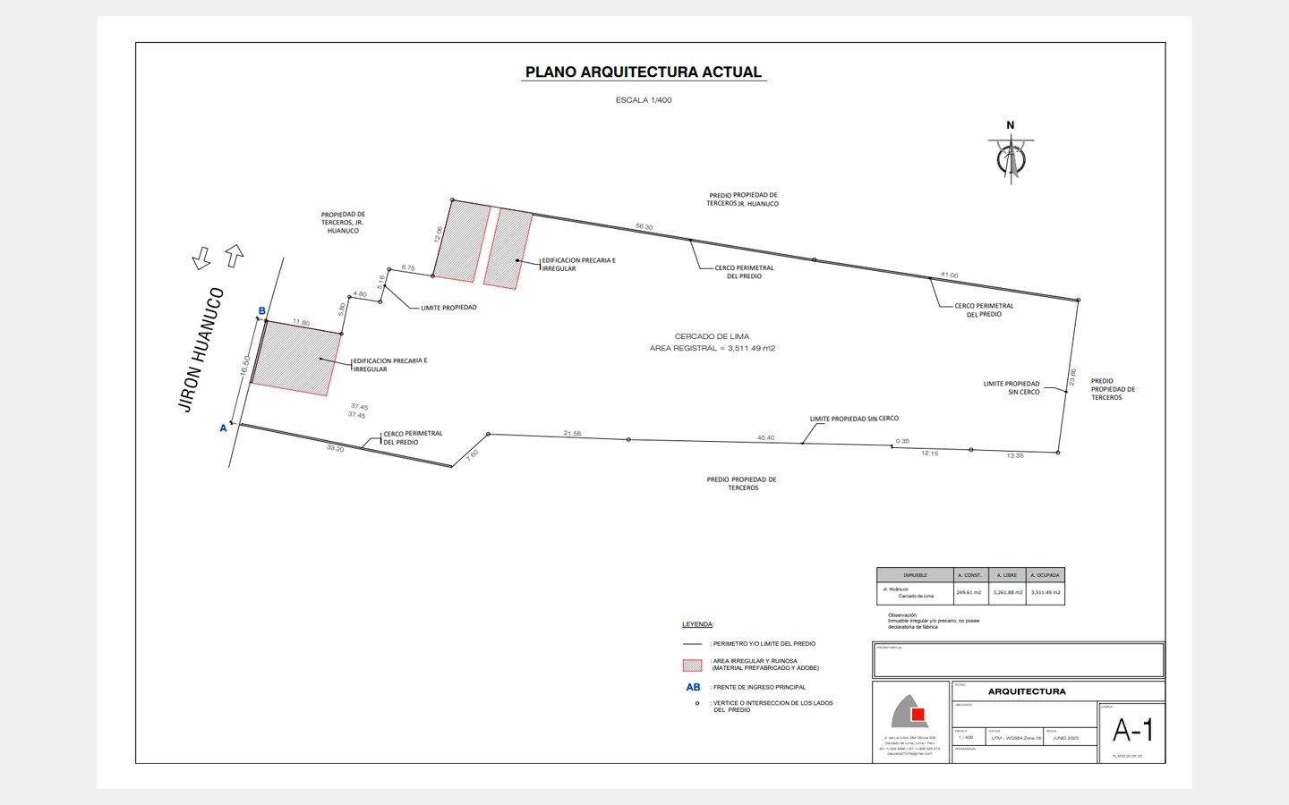 • Terreno cercado, con tres edificaciones precaria que suman 446.31 m2, las mismas que se encuentran semi-demolidas.